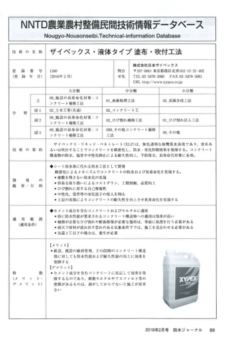 新樹社発行の防水業界専門誌「防水ジャーナル」2018年2月号特集「ブレイクスルー目前の塗布含浸材」において、ザイペックス液体タイプ” XLP”が掲載されました。